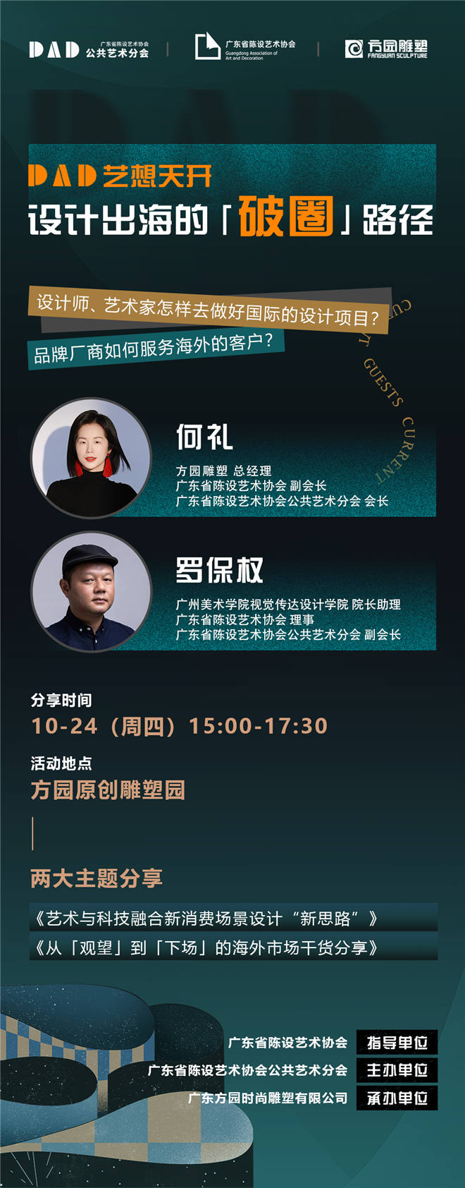 随着信息时代伟大鸿图的展开,数字化设计与公共艺术相互结合的趋势日益明显,中国本土设计师也在全球化语境的开放与交流中,向世界表达着新时代属性下艺术设计美学,为推动设计与艺术的共融共生,共同探索中国设计品牌、艺术家、厂商出海的新路径、新桥梁。广东省陈设艺术协会公共艺术分会以此为契机特举办此次交流分享活动,分享关于艺术设计“出圈”、“出海”的路径思考与行业指南。