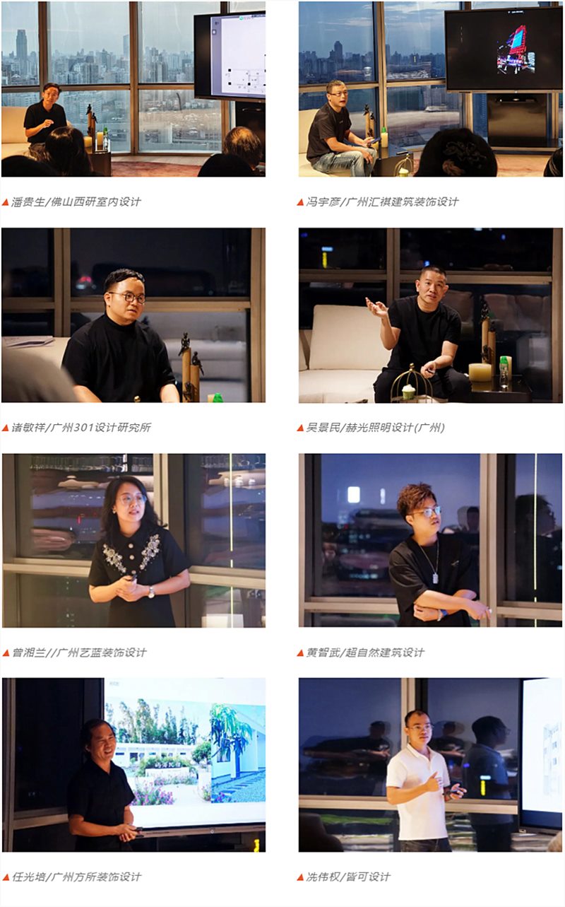 聆听了话题发起人-王小锋的分享后,围绕“以设计语言讲好空间故事”的话题主旨,多位活动来宾纷纷参与随后的即兴分享环节,不仅有最新的住宅项目新作、文旅民宿项目、地产样板间项目、灯光设计项目、自建房改造项目、国外商业空间考察等等等多样的细分领域设计项目,还有设计师对于企业的经营和品牌打造思路、以及AI领域的设计应用思考。