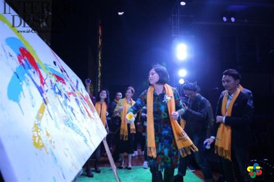 晚会上,艺术家宋珂女士、莫宏士先生和IBID国际品牌与设计交流中心江门设计委的核心成员一起展示设计师的艺术风采,他们潇洒地在一大幅空白油画布上泼涂料作画的形式启动了“江门设计周”的活动。
