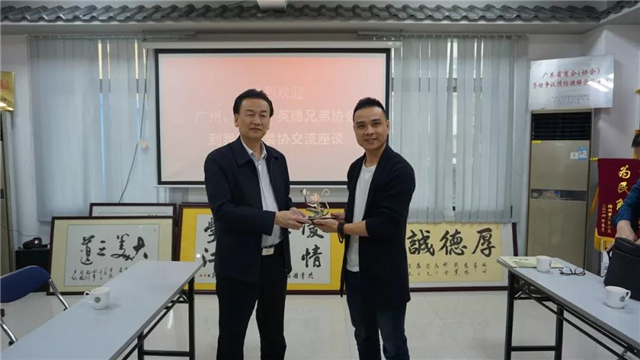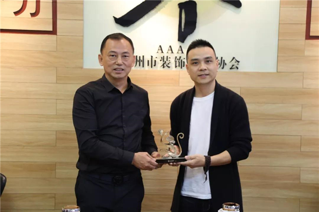 佛室协常务副秘书长阮召锐(图右)代表佛室协赠于纪念品,潮州市装饰行业协会会长蔡韩龙(图左)代表接受。