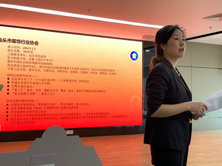 汕头市装饰行业协会秘书长谢莉娜总结他们协会一直以设计师为主导,努力建设有活力的温馨会员之家,具体从几个方面做好服务会员单位的工作:一是重视企业文化建设,二是加强培训造就行业人才,三是热心公益,四是推动会员企业整合资源,五是会员分组,比学赶帮争创会员活跃新局面,这些努力经过多年的验证,在凝心聚力和不断创新“家事“上以及发挥设计师在装饰产业的龙头作用方面取得了显著硕果。