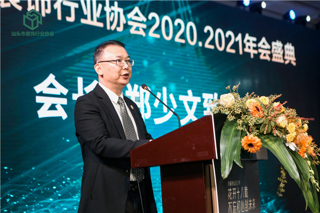由于疫情影响,协会将2020年年会延期与2021年年会同时举办。在当晚的年会盛典上,汕头市装饰行业协会会长郑少文感谢了一路走来同舟共济的会员们,展望未来,协会也会进一步发展壮大。