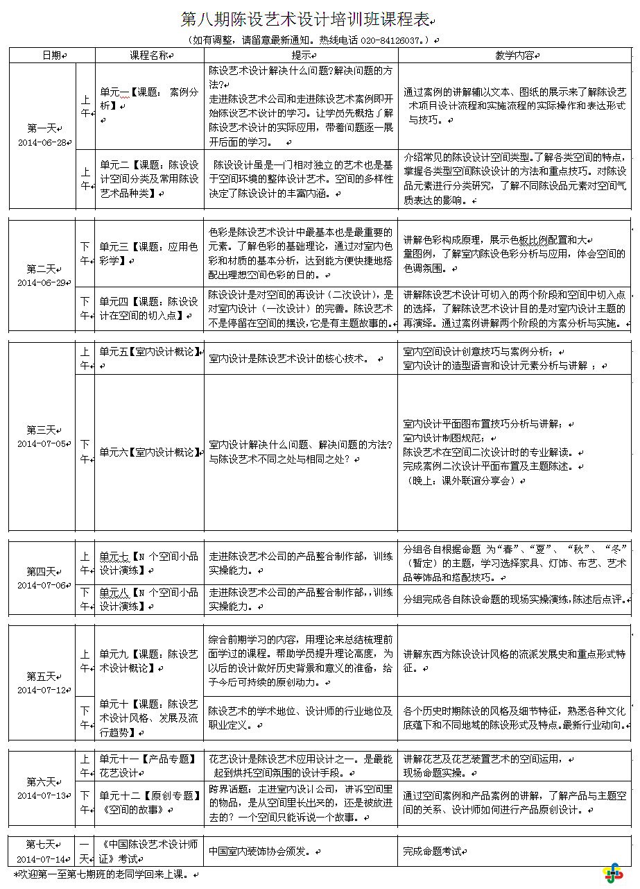 广东省陈设艺术协会和广东设计师中心一直关注行业需求,在中国室内装饰协会的指导和支持下,开设了陈设艺术设计培训班,由广州市蓝莓企业管理咨询有限公司承办,已成功举办七期,并得到社会和行业人士的普遍认可。现应广大从业人员的要求,拟将举办第八期“中国陈设艺术设计师(广州)培训班”第八期培训班将在广泛征求讲师和各届学员意见、总结经验的基础上不断完善,坚持设置有专业特色的课程,针对学员的需求对教学内容和课程设置作适当的更新和调整。此期培训班就将新增“戛迪杯”陈设艺术设计邀请赛获奖作品分享和“若水—‘晶麒麟·华颂’艺术颁奖晚会”及“在此一中国生活艺术”之国家大剧院展的活动分享内容。