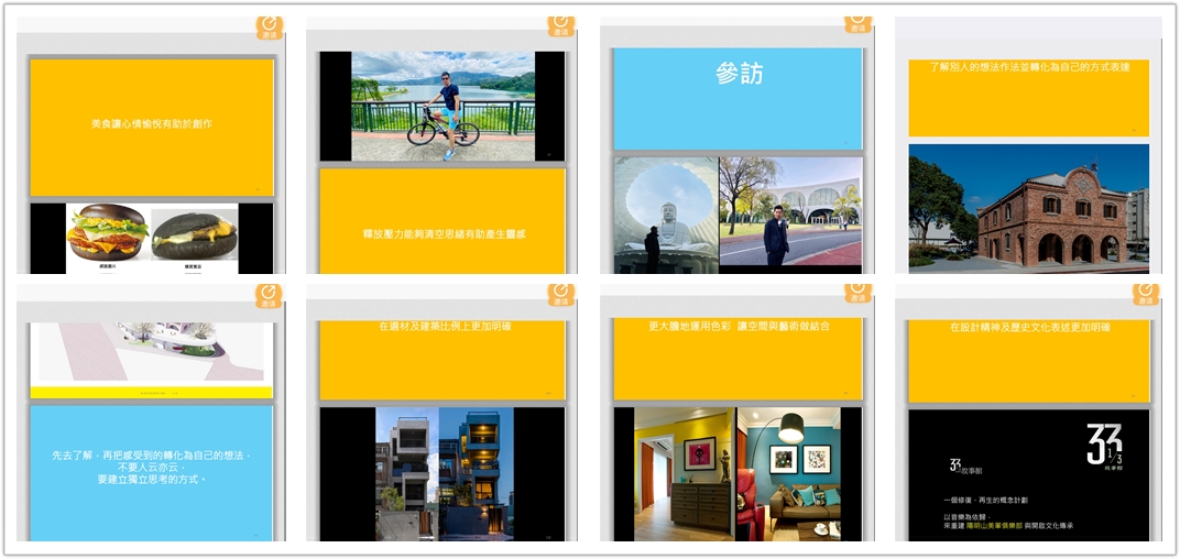 黄建华先生先通过照片逐一从美食、户外运动、旅行、参访、艺术、音乐、时尚、电影动画等方面分享生活中灵感不绝的源泉,并分享了他们团队如何将设计落地于生活空间的特色案例。