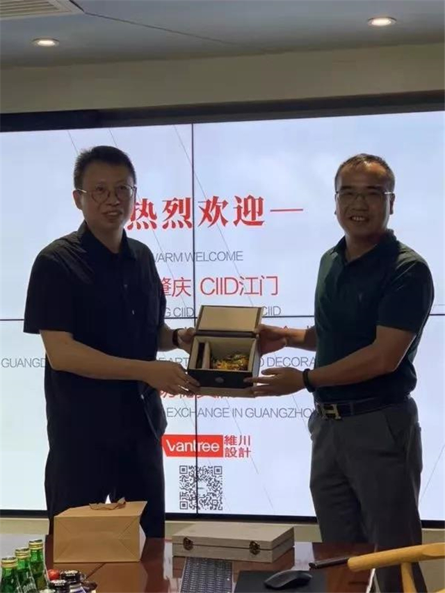小梅姐对大家表示热烈欢迎并做了激动人心的介绍性开场后,许牧川老师进行了长达两小时的分享。许老师平时极少作类似的分享,这真是肇江两地与会设计师的福气!同时,也体现了许老师对肇江两地设计师的关爱。许老师分享了维川公司的历程和一些最终震撼到小伙伴们忘记了提问的案例,分享了作为设计执行角色的重要性,最后还就“之间”这个话题进行了分享探讨,他指出,我们的固有认知与习惯等会成为阻碍我们前进的一堵墙,设计之间,学生与老师之间,我们要把这堵墙砸碎,并值此,许老师鼓励我们冲破藩篱,多做“好玩”的设计。分享结束,肇江代表,理事代表分别与许老师交换了礼物。