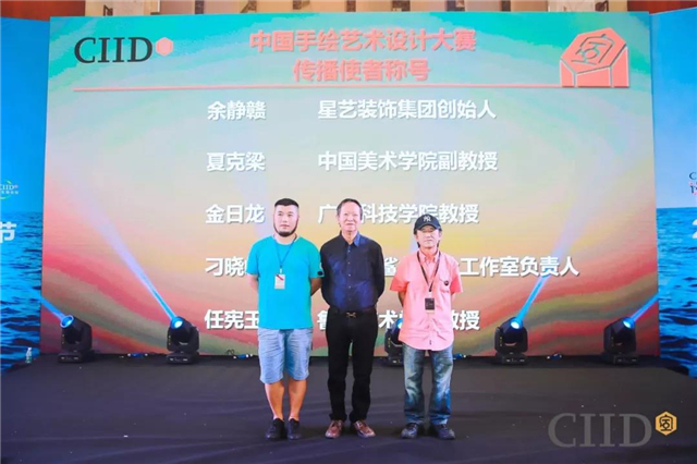 颁奖典礼上,为五位“中国手绘艺术设计大赛”传播使者颁发了荣誉证书,对他们在设计领域的手绘艺术实践应用、教学培训以及赛事宣传推广等方面做出的重大贡献表示真诚的感谢。他们是:星艺装饰集团创始人余静赣、中国美术学院副教授夏克梁、广东科技学院教授金日龙、重庆小鲨鱼手绘工作室负责人刁晓峰和鲁迅美术学院教授任宪玉。
