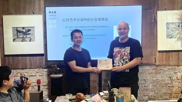 现场与会理事们全体举手同意、鼓掌祝贺,公共艺术分会会长梁永标为新增理事授牌。
