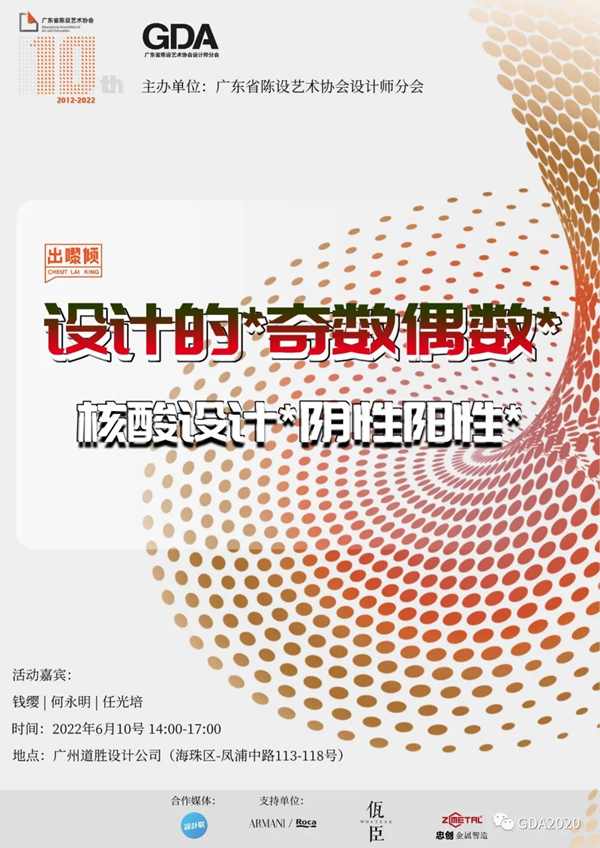 2022年6月10日下午,由广东省陈设艺术协会设计师分会GDA主办品牌论坛活动:「出嚟倾」——设计的“奇数偶数”+核酸设计 “阴性阳性”在道胜设计热烈开倾。本次「出嚟倾」作为协会十周年成立系列活动,请来道胜设计何永明老师,广州美术学院钱缨教授,广东工业大学任光培老师一同为大家带来这场富有意义、诱发深思的设计方法论分享,为设计师们提供更多的设计灵感来源。