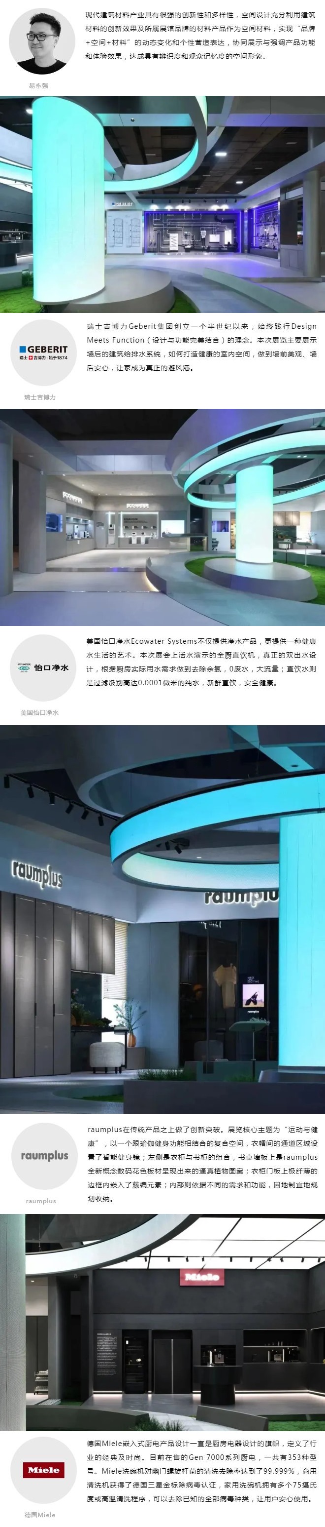 作为瑞士吉博力、美国怡口净水、raumplus、德国美诺四个品牌联合展厅。展厅的设计力求把品牌产品的专业严谨、精工品质、产品创新精神及绿色健康的理念呈现给观众。